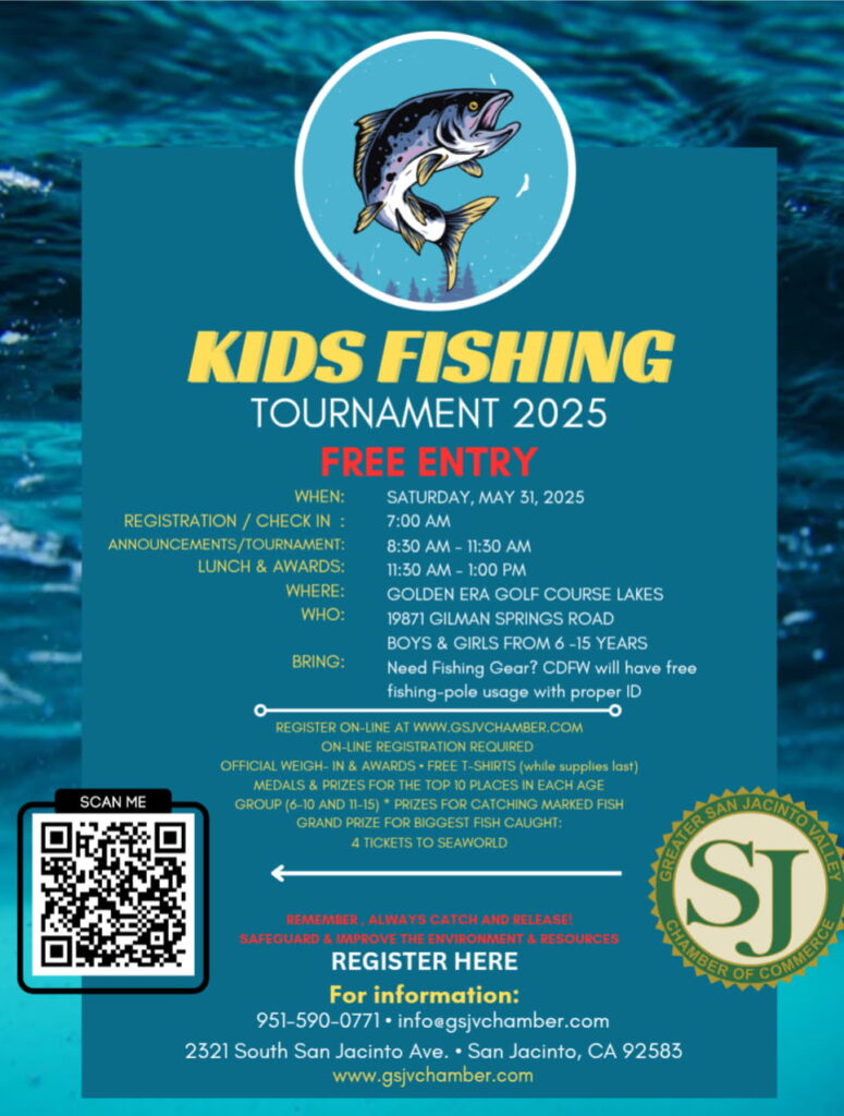 Get ready for a day of outdoor fun, fishing, and family at the 4th Annual Free Kids Fishing Tournament, happening Saturday, May 31, at the beautiful Golden Era Golf Course in San Jacinto. The event is proudly organized by a large committee of like-minded Community led by Bass Master Albert Kissinger, along with The Greater San Jacinto Valley Chamber of Commerce.