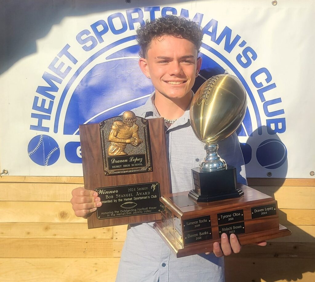 Draven Lopez from Hemet High School received the Bob Stangel Award and a $1,000 scholarship toward his post high school education. Other 2024 Bob Stangel Award finalists were Cole Haley, Hamilton High; Robert Valencia, Noli Indian School; Daylen Love, San Jacinto High; Nahamani Hamala, San Jacinto Valley Academy; Romeo Evans, Tahquitz High; and Nathan Hutton, West Valley High.