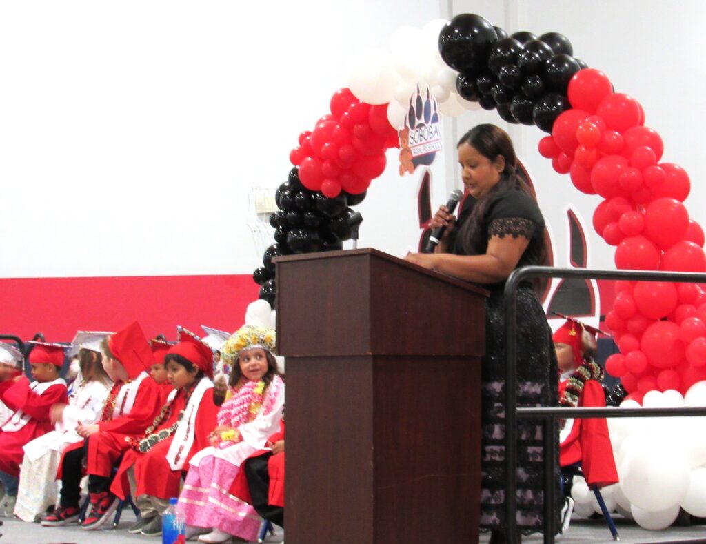 After they all took their seats on stage, Preschool Administrator Lenora “Ponie” Mojado welcomed everyone to the event. Her words were heartfelt and a little bittersweet as she recalled the past year working with the students, many who she has known throughout the seven years she has been at the preschool, first as a teacher’s aide and then as a preschool teacher