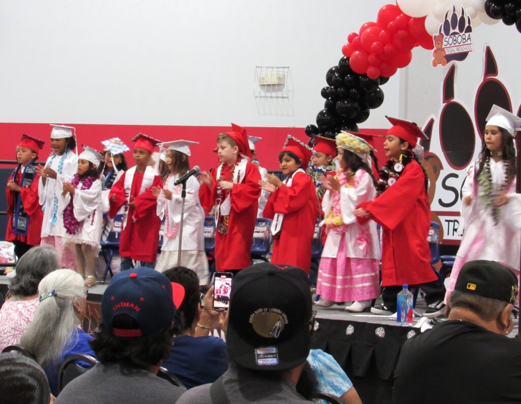 The Soboba Sports Complex was filled with proud family members of the 19 kindergarten students who were graduating from the Soboba Tribal Preschool June 2. With pint-size caps and gowns, the children entered the gymnasium to the strains of Pomp and Circumstance and applause.