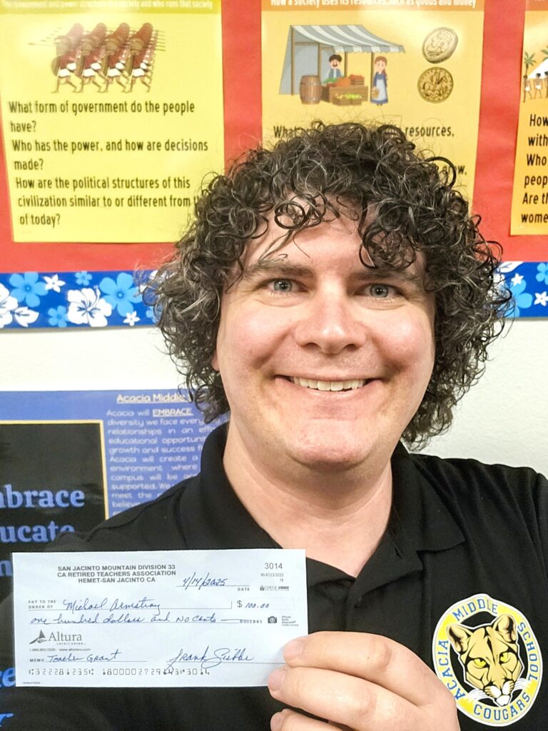 Michael Armstrong, a 6th and 7th-grade Social Studies teacher at Acacia Middle School in Hemet, intends to invest in basic classroom supplies, restock art materials for projects, and introduce new resources to facilitate discussions and debates using primary sources. “How exciting! Thank you!” Armstrong said upon receiving the grant.