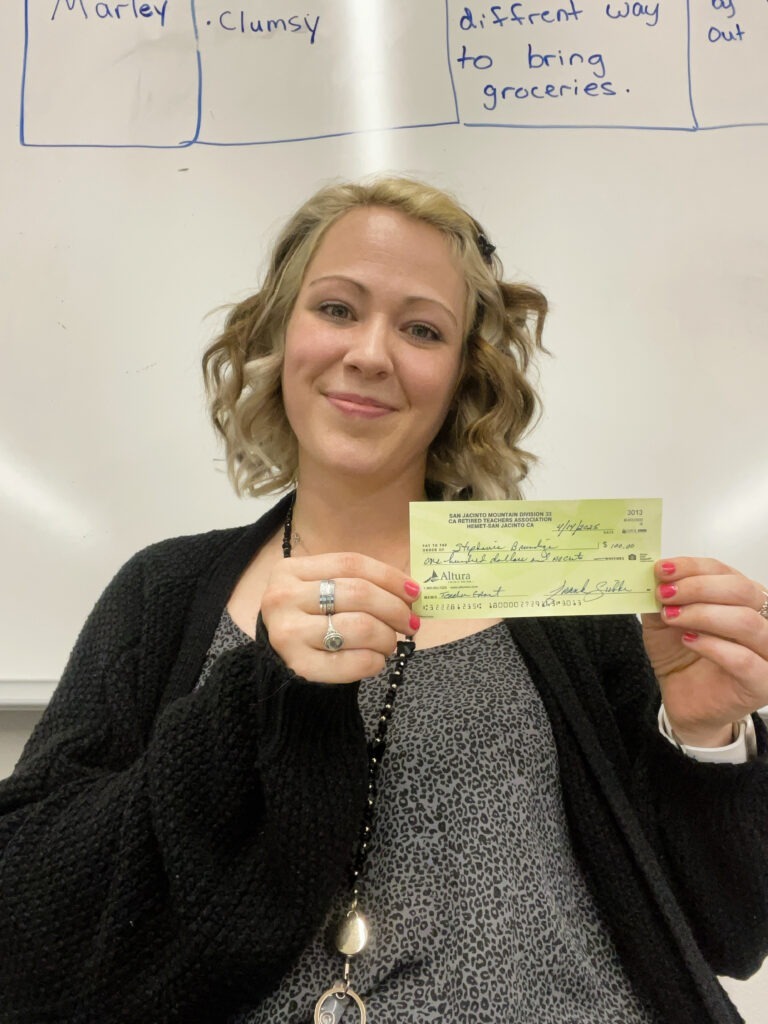 Nearly 90 educators from Hemet, San Jacinto, Menifee, Romoland, and Nuview School Districts applied for the California Retired Teachers Association (CalRTA) Division 33’s $100 Teacher Grants, a program designed to provide financial support for classroom projects and resources. At their recent April luncheon, four teachers were randomly selected to receive the funds, each with inspiring plans to enrich their students’ education.