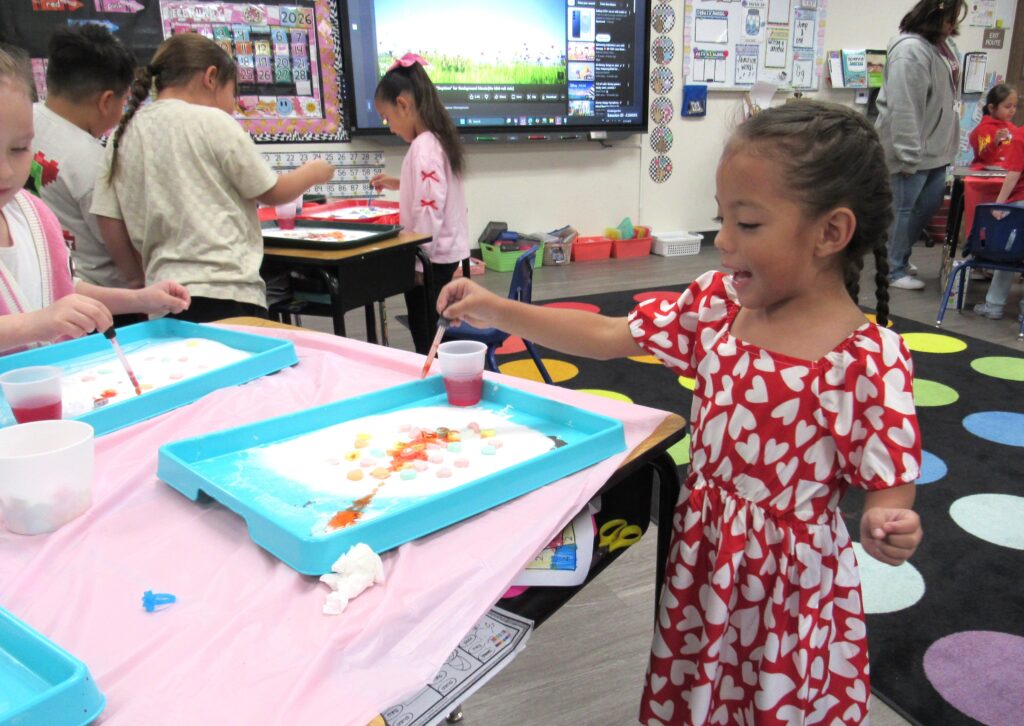 Alaina Adkins kept her kindergarten students busy with a science lesson before they distributed their grams and enjoyed the treats that were donated by staff and families. With the help of instructional aide Jasmine Basquez, students were given a tray filled with baking soda and a bowl of colorful candy conversation hearts. Then each one received a small cup filled with purple or red vinegar and an eyedropper. They were instructed to place the candy hearts onto the baking soda (and not to eat them) and then fill the dropper with some vinegar to release on each of the hearts.