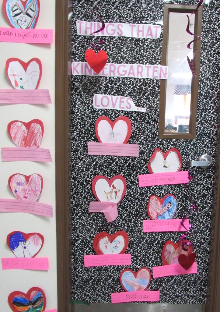 Soboba Tribal Preschool classroom doors are decorated for the holiday and this one shares what kindergarten students love which includes moms, kittens, pets and friends.